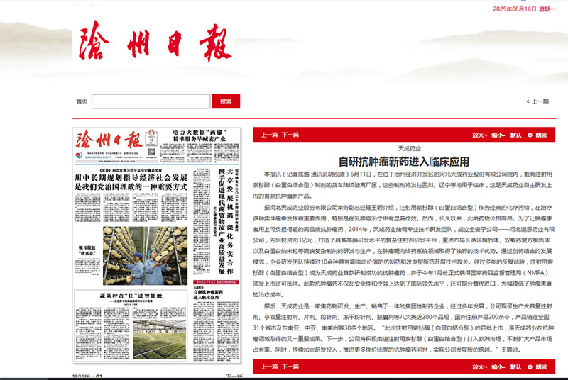 据悉,天成药业是一家集药物研发、生产、销售于一体的集团性制药企业,经过多年发展,公司现可生产大容量注射剂、小容量注射剂、片剂、粉针剂、冻干粉针剂、胶囊剂等八大类近200个品规,国外注册产品200余个,产品销往全国31个省市及东南亚、中亚、南美洲等30多个地区。“此次注射用紫杉醇(白蛋白结合型)的获批上市,是天成药业在抗肿瘤领域取得的又一重要成果。下一步,公司将积极推进注射用紫杉醇(白蛋白结合型)打入欧洲市场,不断扩大产品市场占有率。同时,持续加大研发投入,推进更多性价比高的抗肿瘤药问世,实现公司发展新的跨越。”王颢说。